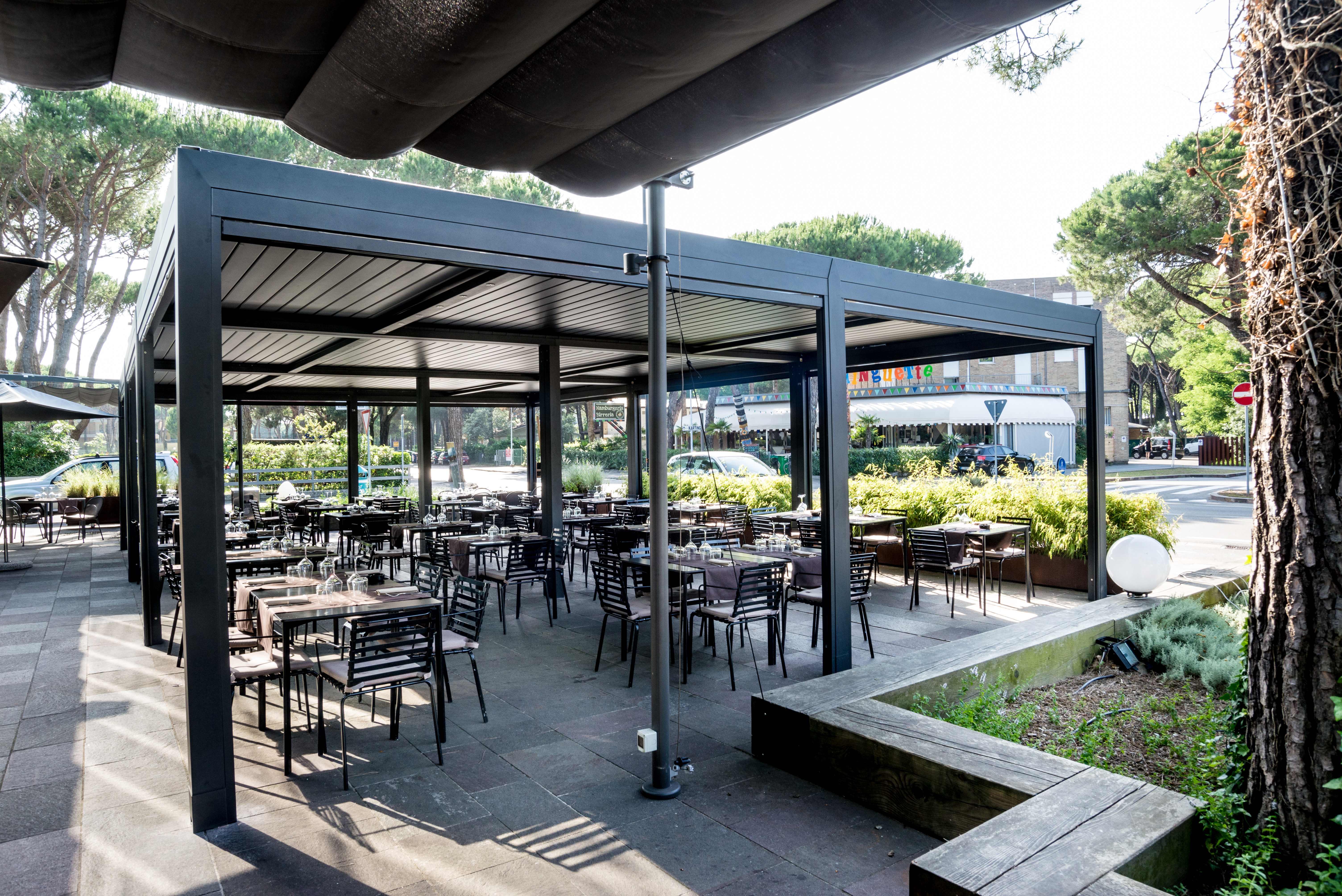 Schermatura solare autoportante in alluminio con tetto a lame orientabili composta da un profilo grondaia perimetrale che permette la rotazione delle lame e lo scarico dell’acqua. La movimentazione avviene attraverso l’utilizzo di motori lineari. Resistenza al vento garantita fino alla classe 6 secondo la EN 13561. Oltre i 6 mt di Sp. la struttura sarà dotata di barra stabilizzatrice.