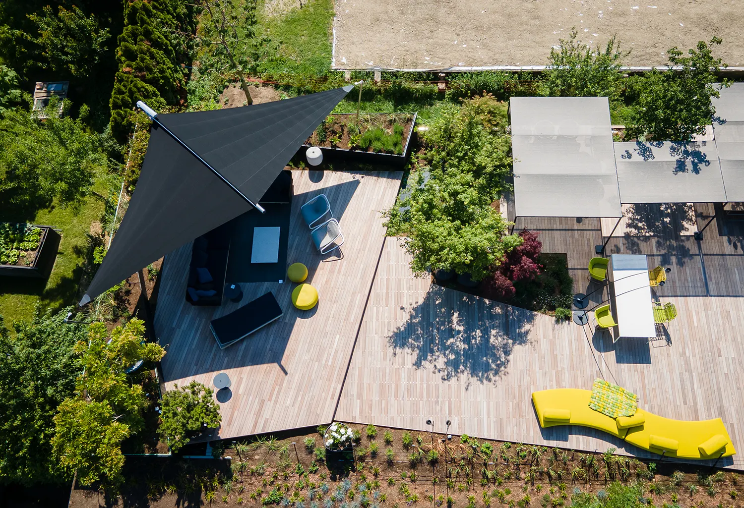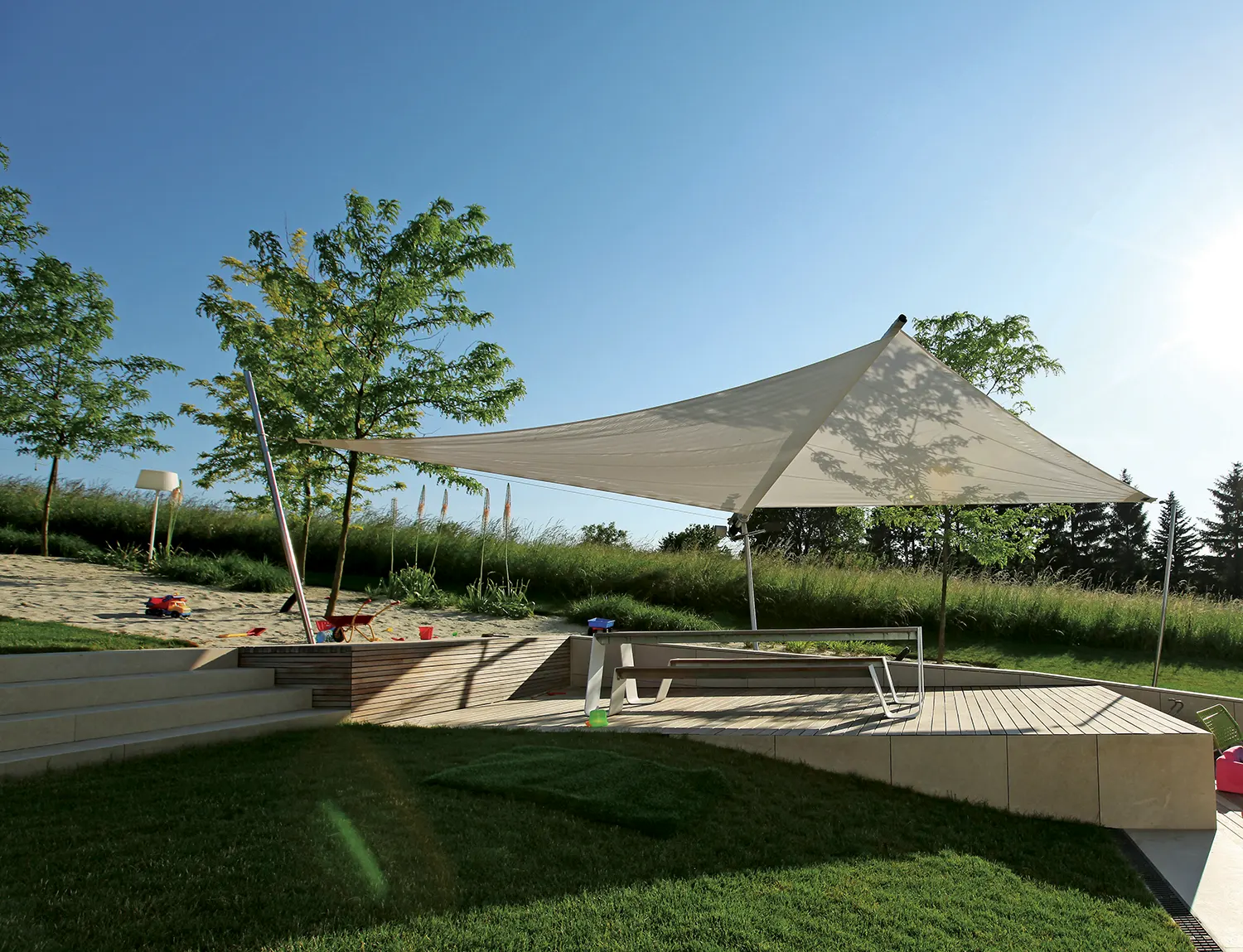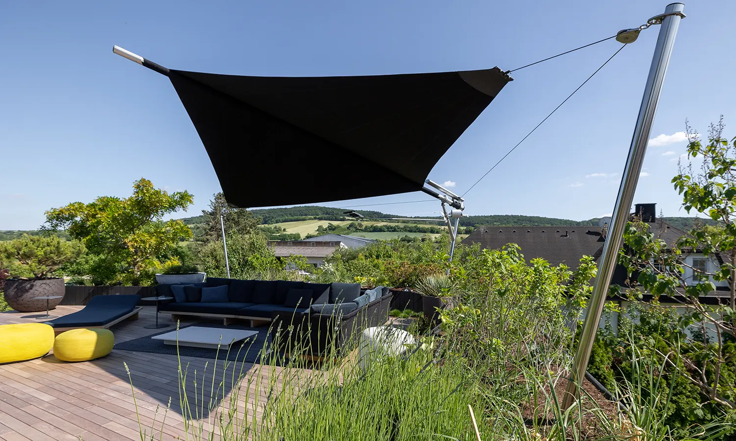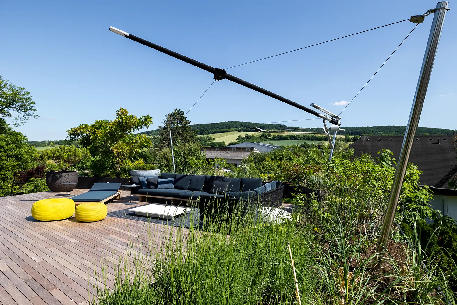 La vela SunSquare® Cantilever con albero a sbalzo – ci sono solo tre punti di attacco (supporti a parete o pavimento).