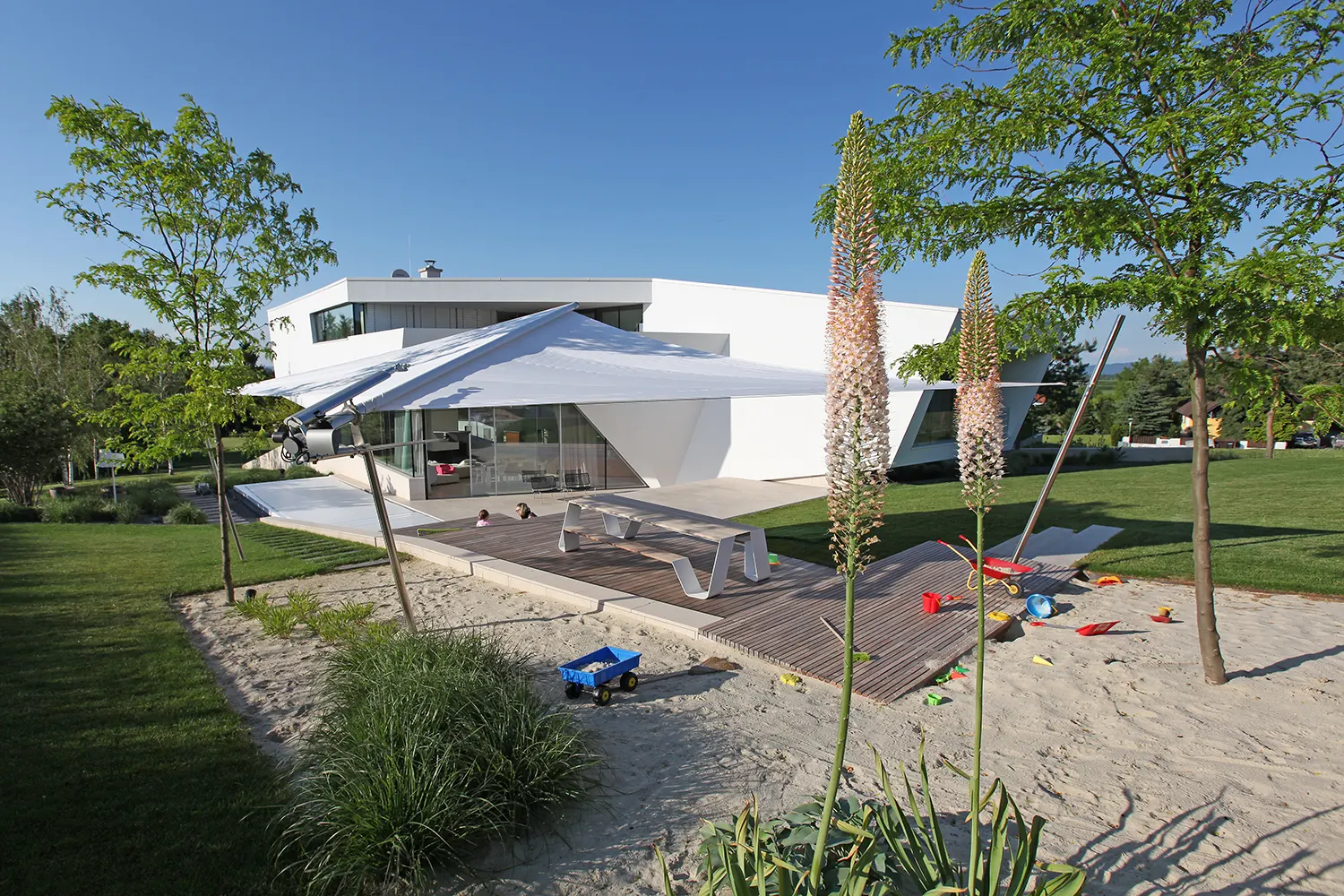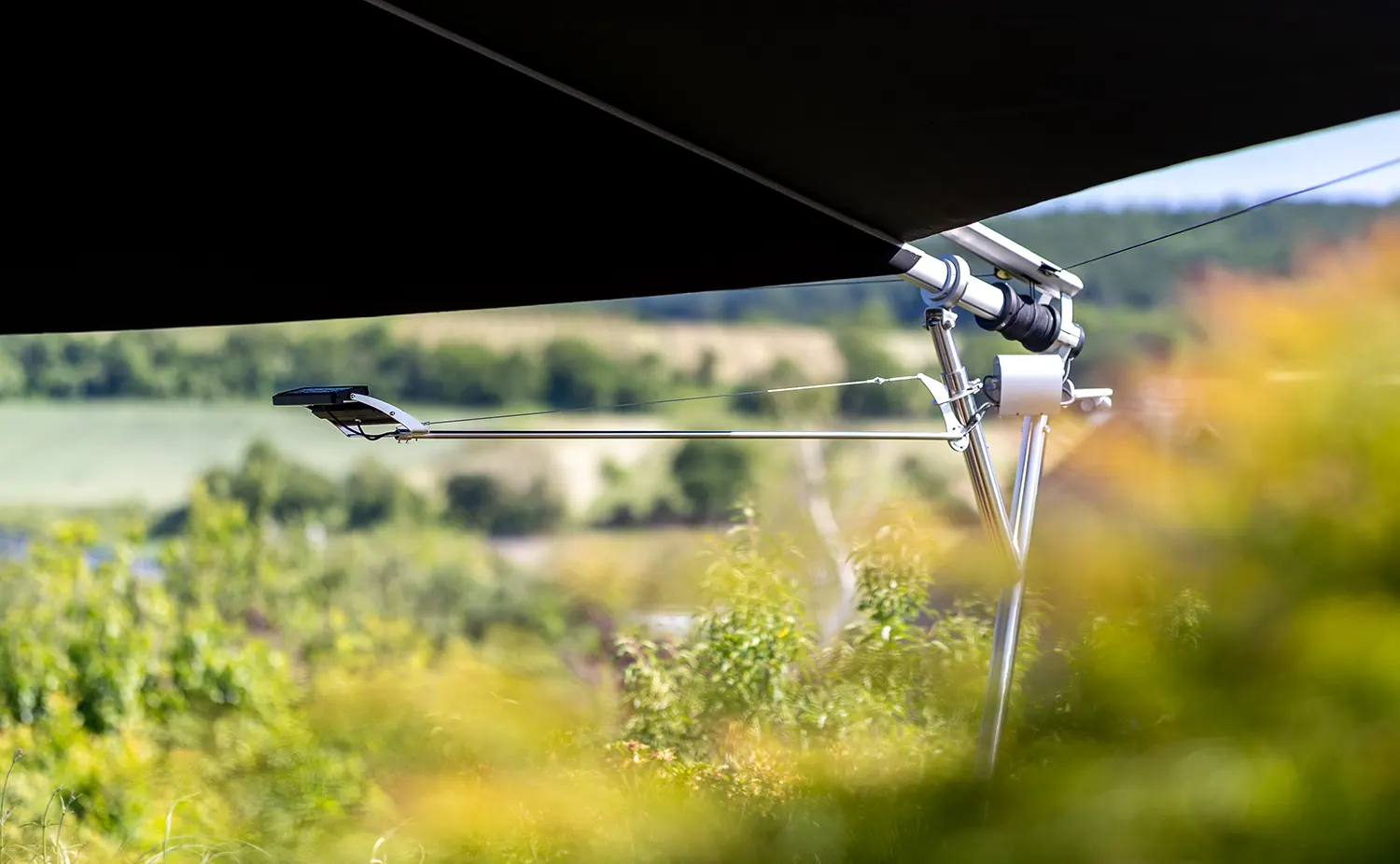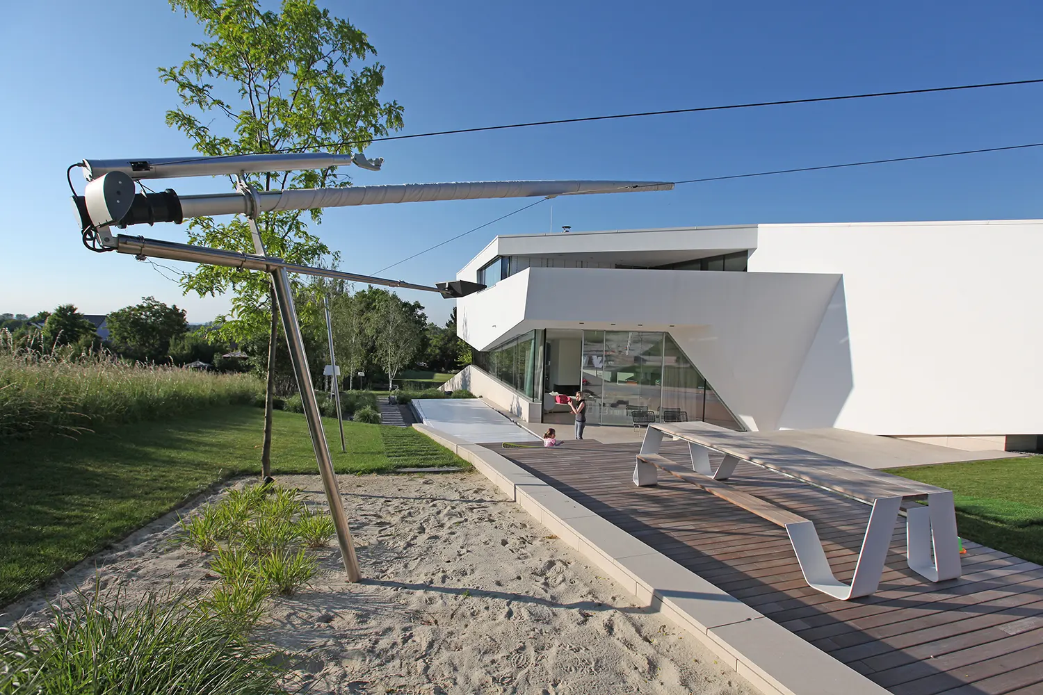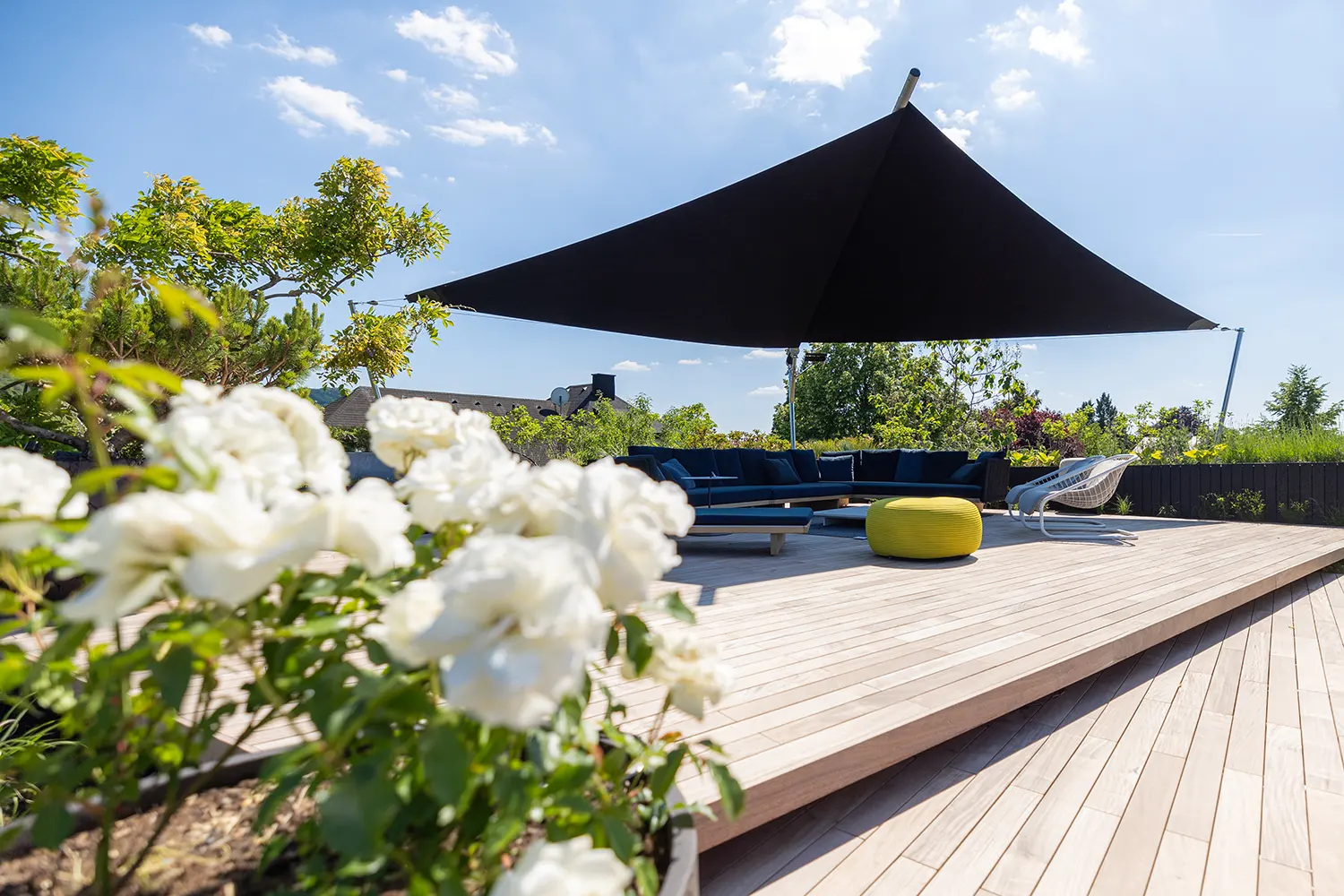 La vela SunSquare® Cantilever con albero a sbalzo – ci sono solo tre punti di attacco (supporti a parete o pavimento).