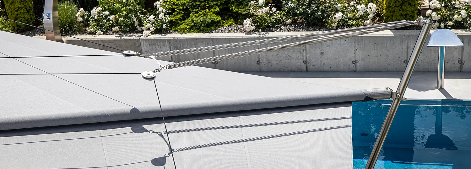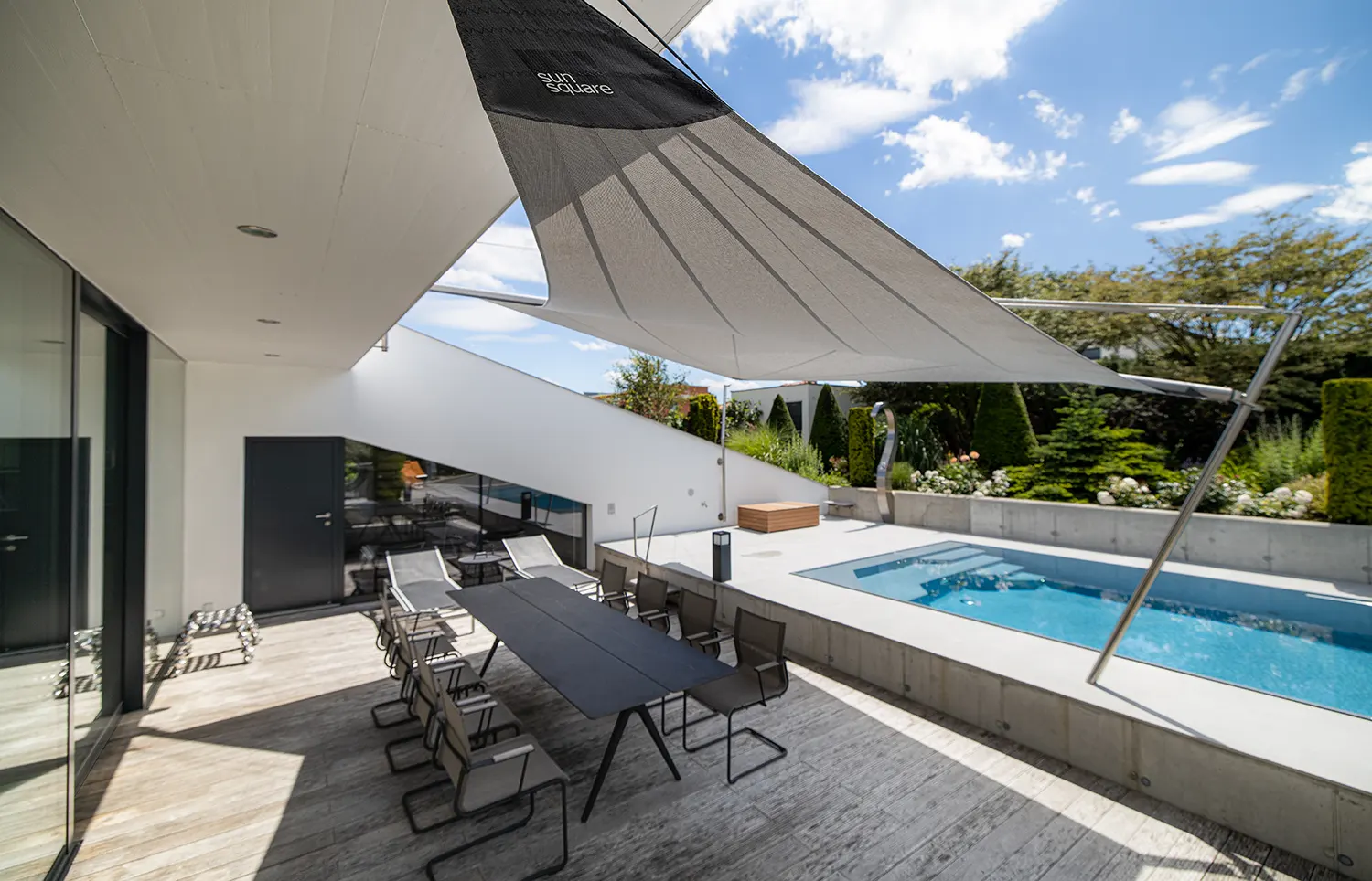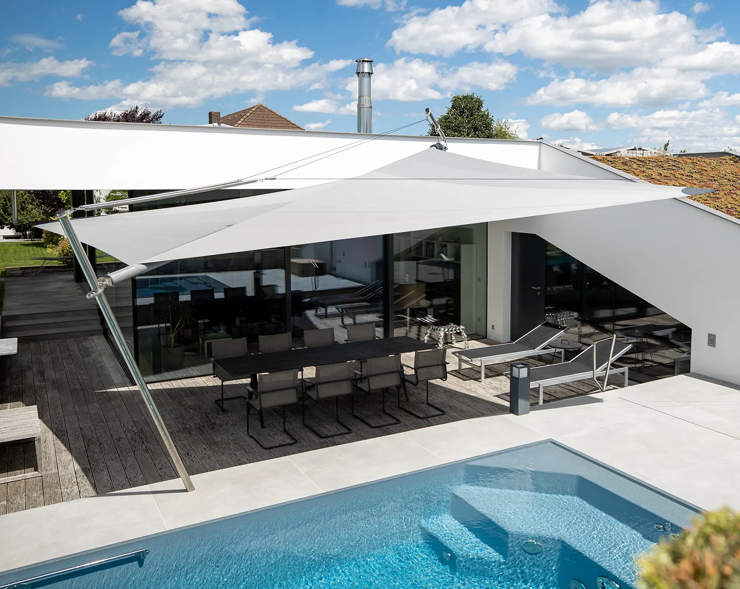 La classica vela da sole SunSquare® con un bilanciatore a molla sul supporto F.